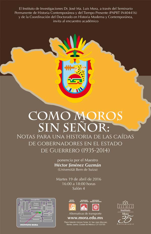 El Instituto de Investigaciones Dr. José María Luis Mora, a través del Seminario Permanente de Historia Contemporánea y del Tiempo Presente (PAPIIT IN404416) y la Coordinación del Doctorado en Historia Moderna y Contemporánea invita al encuentro académico Como moros sin señor: Notas para una historia de las caídas de gobernadores en el estado de Guerrero (1935-2014), ponencia presentada por el Mtro. Héctor Jiménez Guzmán (Universität Bern de Suiza). Martes 19 de abril, de 16:00 a 18:00 horas, salón 4 del Instituto Mora.